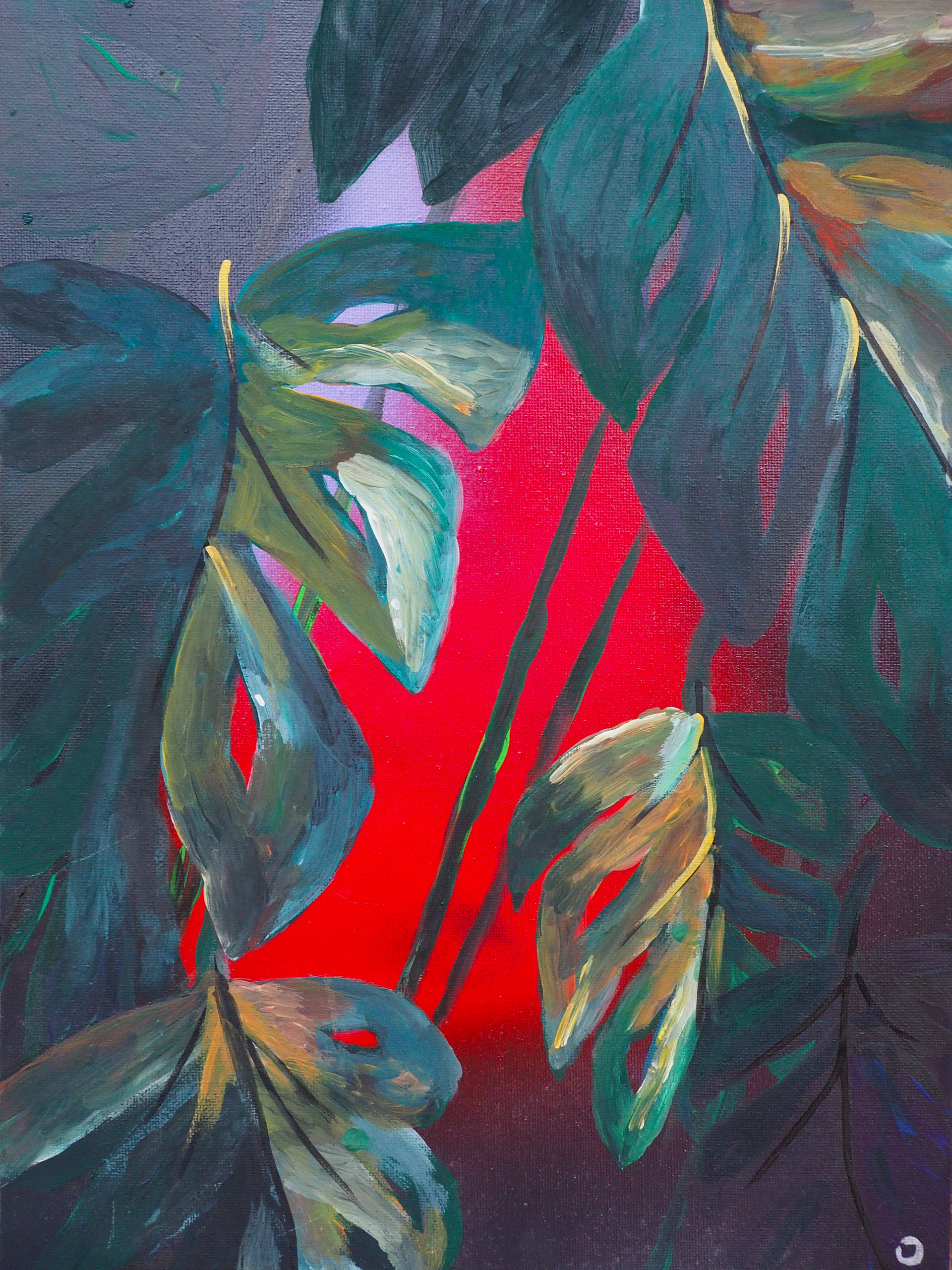La rappresentazione dal punto di vista dell’osservatore é strutturata volutamente come un mondo oltre le foglie di monstera. Come se quella emozione sia “Oltre” le foglie. Come se spostando le foglie si possa accedere, appunto, al mondo che si sta osservando nascosti e protetti dalle foglie.